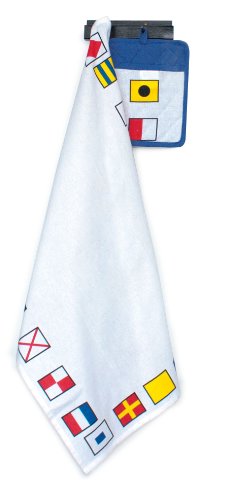 Janey Lynn's 4-piece set, 1 20-inch by 28-inch in red lattice, 1 white with nautical border print and 2 6-inch by 8-inch nautical border print potholders.