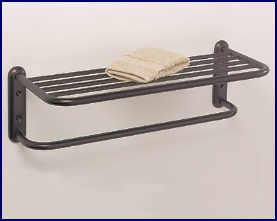 Bronze towel rack in the Hotel Spa or Train Rack style with towel rod. Perfect for your bathroom, pool area, or laundry room. All metal with a Burnished Bronze finish. ** This type of Bronze finish is a dark brown color with speckled copper highlights showing through. Overall measurements 21 1/2" wide and 6 1/2" high. Shelf is 20 1/2" wide. Projects out from the wall 9" . Easy to assemble and mount. Includes screws for mounting. It also has towel drying bar on the bottom. More bath accessories and faucets available in our storefront. Please contact us if you have any questions.