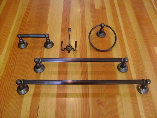 - 5 Piece set includes Toilet paper holder, towel ring, robe hook, 18" and 24" towel bars