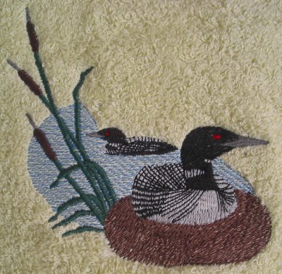 100% cotton thick terry bath towel set. Embroidered on beige towels are two loons floating on the water. The design is embroidered with long lasting color fast polyester thread. Machine washable. Included in the set is: 1 embroidered bath towel, 30? x 54? 1 embroidered hand towel, 16? x 29? 1 plain wash cloth, 13? x 13?