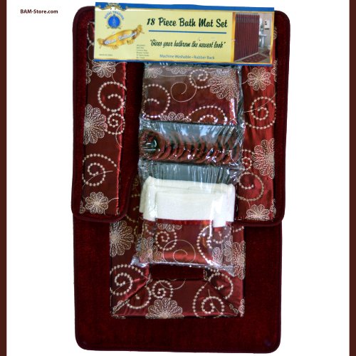 For 25.00 (plus about 10.00 shipping, to Baltimore anyway), you can't exactly expect a top quality bathroom set. Overall, though, I'm pretty pleased with this one. The photo is a little misleading, both for the better and for the worse. The color is, in fact, a richer red than is shown, and the patterned parts are satin embroidered in cream. The pattern is a lovely abstract floral design. It's a bit Christmas-y, but it matches my red bathroom well, so I'm happy on that front.