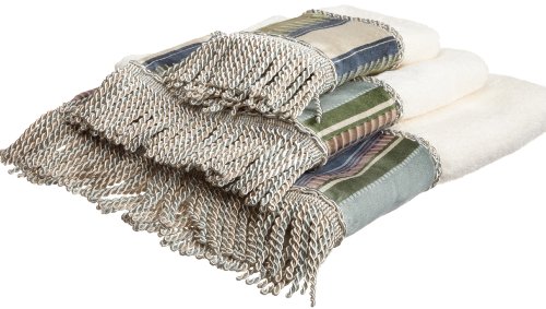 Beige towel with spice striped band and hanging tassels. Towel set includes one Bath Towel, one Hand Towel and One Wash Cloth. This Elite design is a beautiful update for your modern bathroom. Coordinates with our matching bath accessories, rug and shower curtain. Item is machine wash cold. Towel Color: Beige