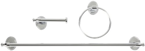 Coordinate your bathroom with this elegantly designed Calais 3-piece bath set in chrome finish presented in colored view box. Set includes 24" towel bar; euro toilet tissue holder and towel ring.