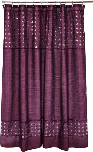 This shower curtain has multi color sequin dots band on a color shower curtain. 100-percent Polyester.